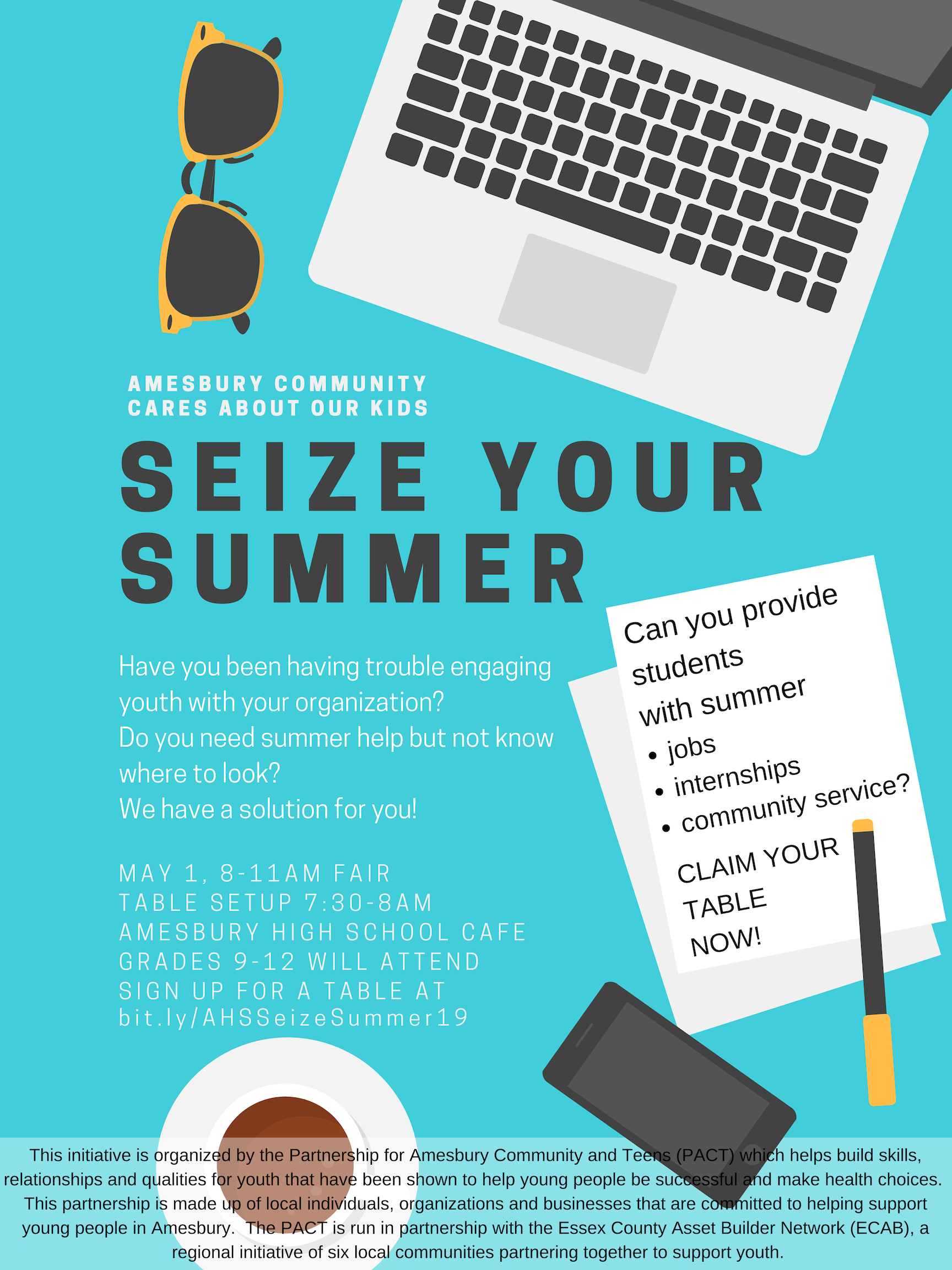 On a recent survey, 38% of youth, grades 6-12, responded that they felt young people are given useful roles in the community, and only 27% felt they were valued by adults in the community. As local businesses and non-profits, we know youth are valuable as consumers, future workers and community members. We want to help connect youth with local businesses to help youth feel valued and also gain impactful real life experiences. We are launching a “Seize Your Summer” event at the high school on May 1st. Where youth will have the opportunity to hear about local job, internship and volunteer opportunities available in Amesbury for them this summer. We are asking if you would like to participate in this event.
